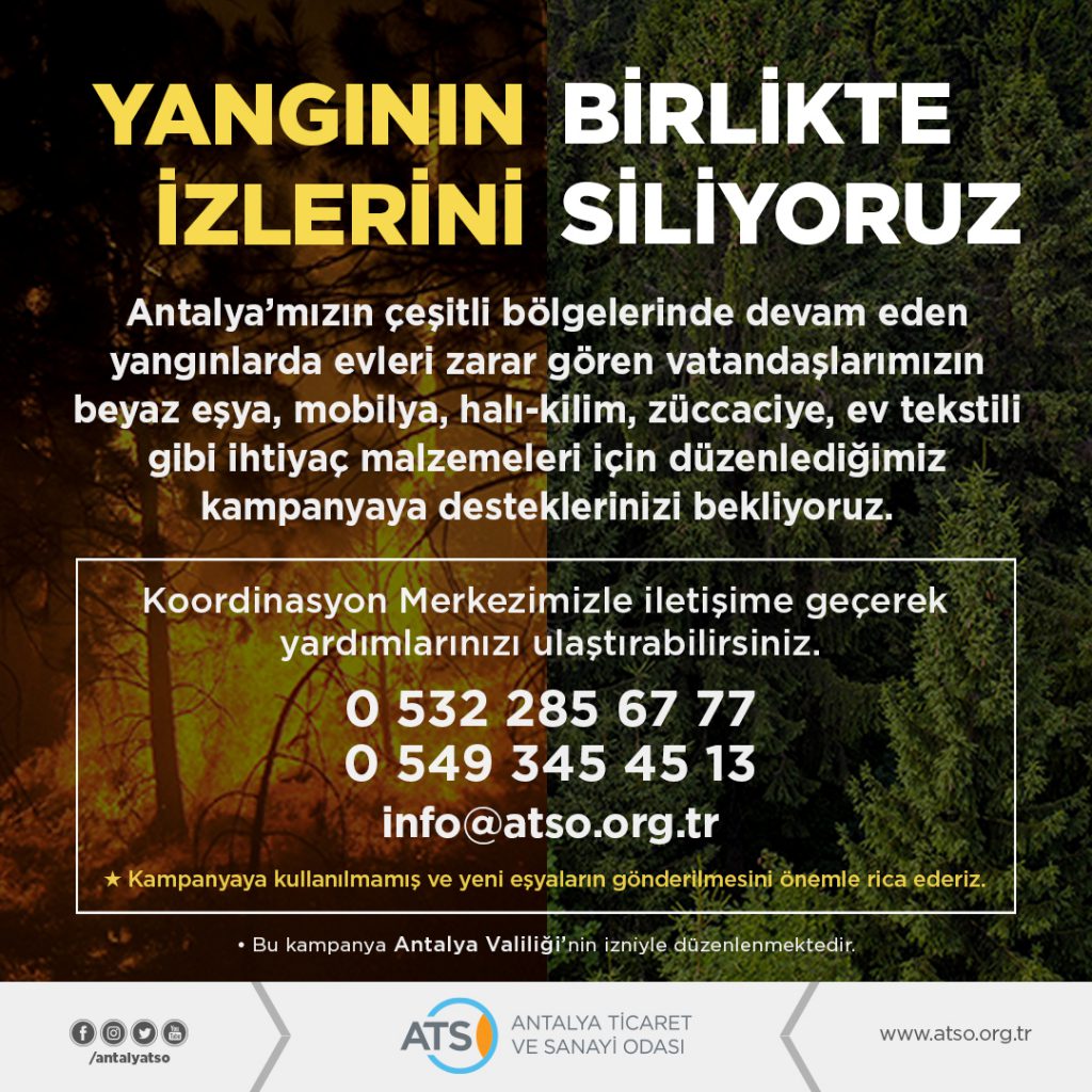 Antalya Ticaret ve Sanayi Odası (ATSO), başta Manavgat olmak üzere Antalya’nın çeşitli bölgelerinde devam eden orman yangınlarında zarar gören tüm vatandaşların ihtiyaçlarının karşılanması amacıyla bir kampanya başlattı. Beyaz eşya, mobilya, ev tekstili, halı, züccaciye, elektrikli ev aletleri vb. ayni yardımlar, ATSO tarafından toplanarak, yangın sahasında çalışan yetkili kurumlar koordinasyonunda evi hasar görmüş ailelere ulaştırılacak.
