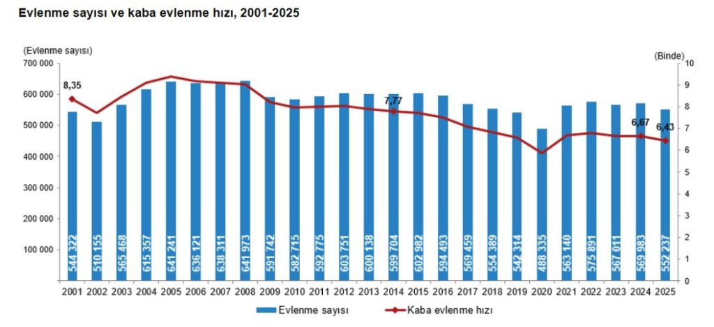 Evlenen çiftlerin sayısı 2024 yılında 569 bin 983 iken 2025 yılında 552 bin 237 oldu. Bin nüfus başına düşen evlenme sayısını ifade eden kaba evlenme hızı 2025 yılında binde 6,43 olarak gerçekleşti.