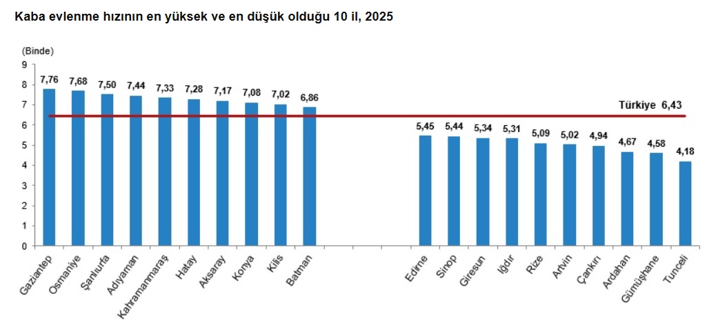 Kaba evlenme hızının 2025 yılında en yüksek olduğu il, binde 7,76 ile Gaziantep oldu. Bu ili binde 7,68 ile Osmaniye, binde 7,50 ile Şanlıurfa izledi. Kaba evlenme hızının en düşük olduğu il ise binde 4,18 ile Tunceli oldu. Bu ili binde 4,58 ile Gümüşhane, binde 4,67 ile Ardahan izledi.