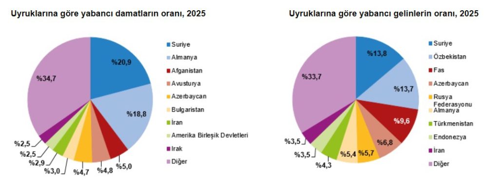 Yabancı damatlar uyruklarına göre incelendiğinde, yabancı damatlar içinde %20,9 ile Suriyeli damatlar birinci sırada yer aldı. Suriyeli damatları %18,8 ile Alman damatlar ve %5,0 ile Afgan damatlar izledi.