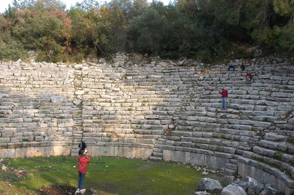 Tiyatrosu yaklaşık bin 500 – 2 bin kişilik bir kapasiteye sahiptir. Hem kente hem de denize hakim olan tiyatroya ana caddeden taş merdivenlerle çıkılmaktadır. İki kattan oluşan tiyatronun üst kısmı günümüze ulaşamamıştır.
