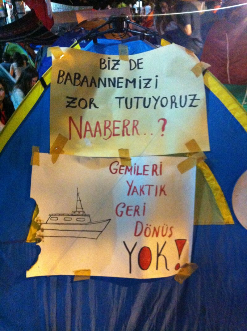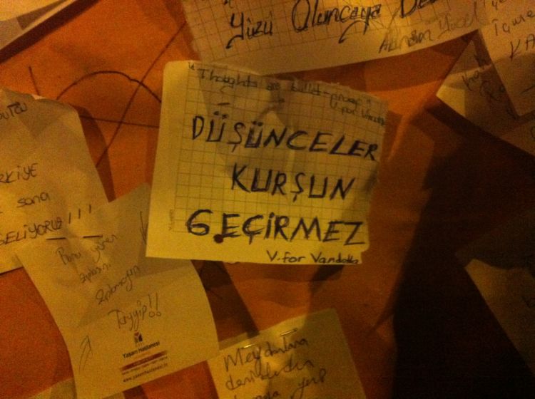 Ziyaretçiler alanda asılı dev bir pankartın üzerine protesto ve destek mesajları yapıştırıyor.