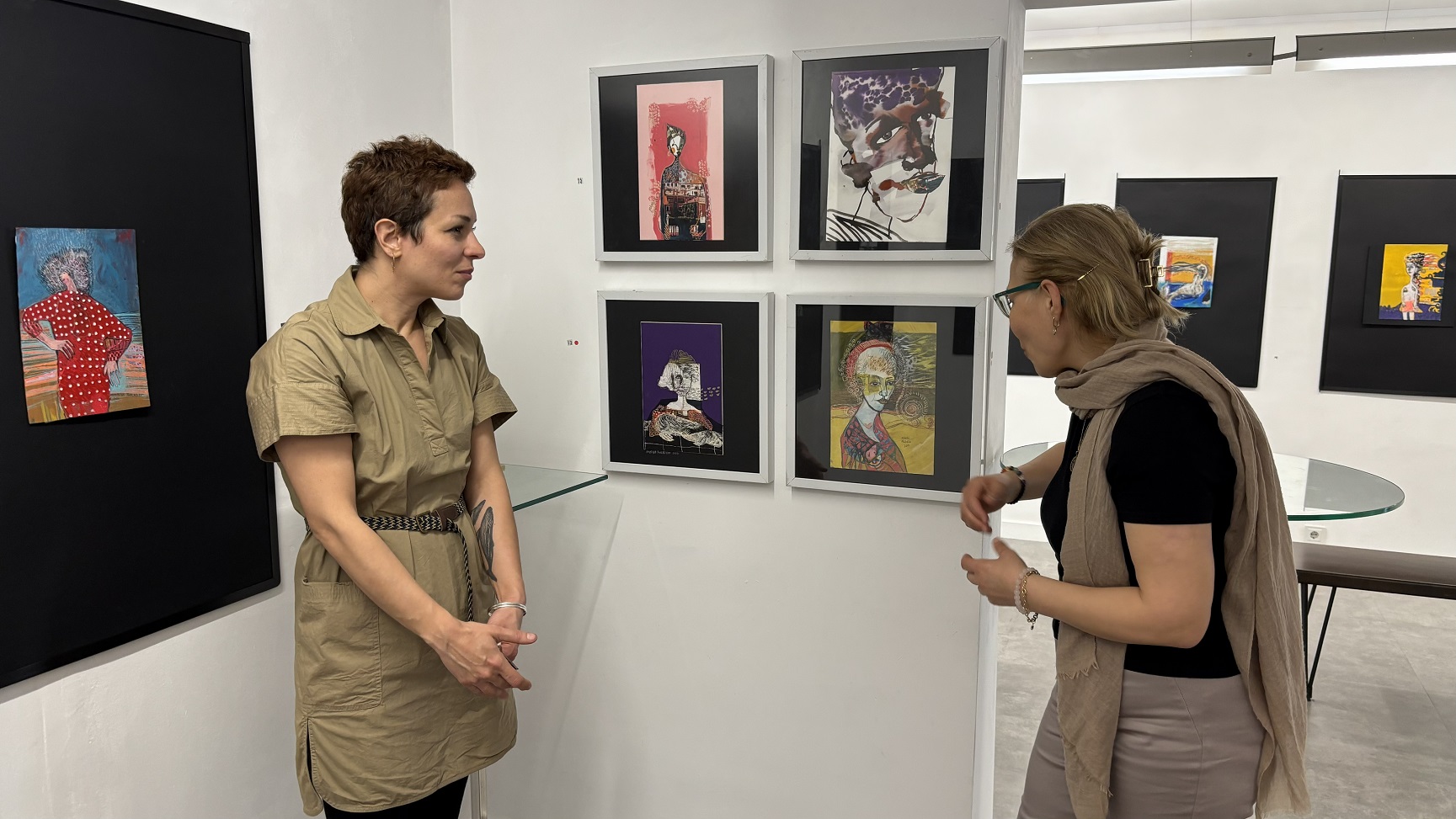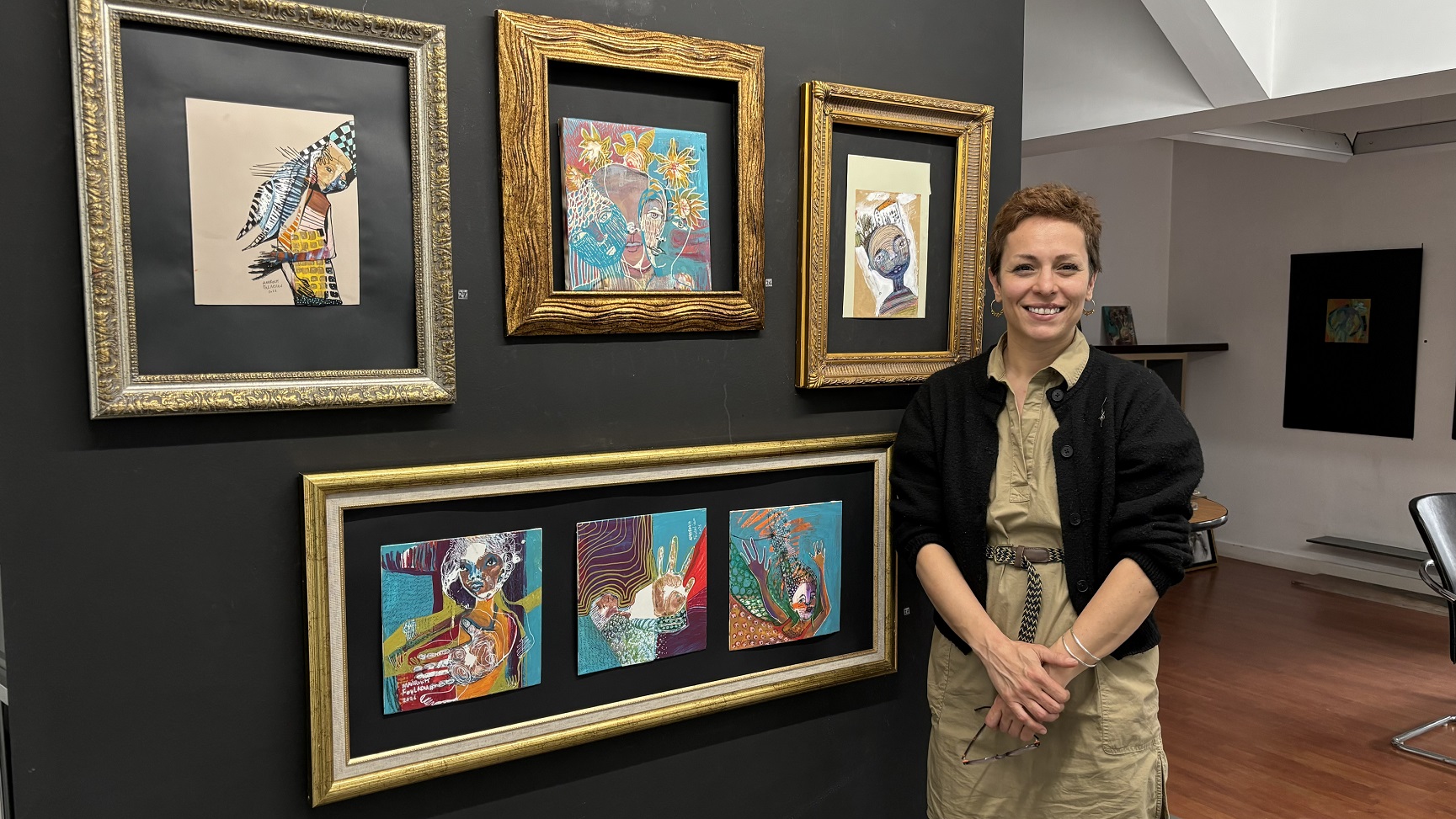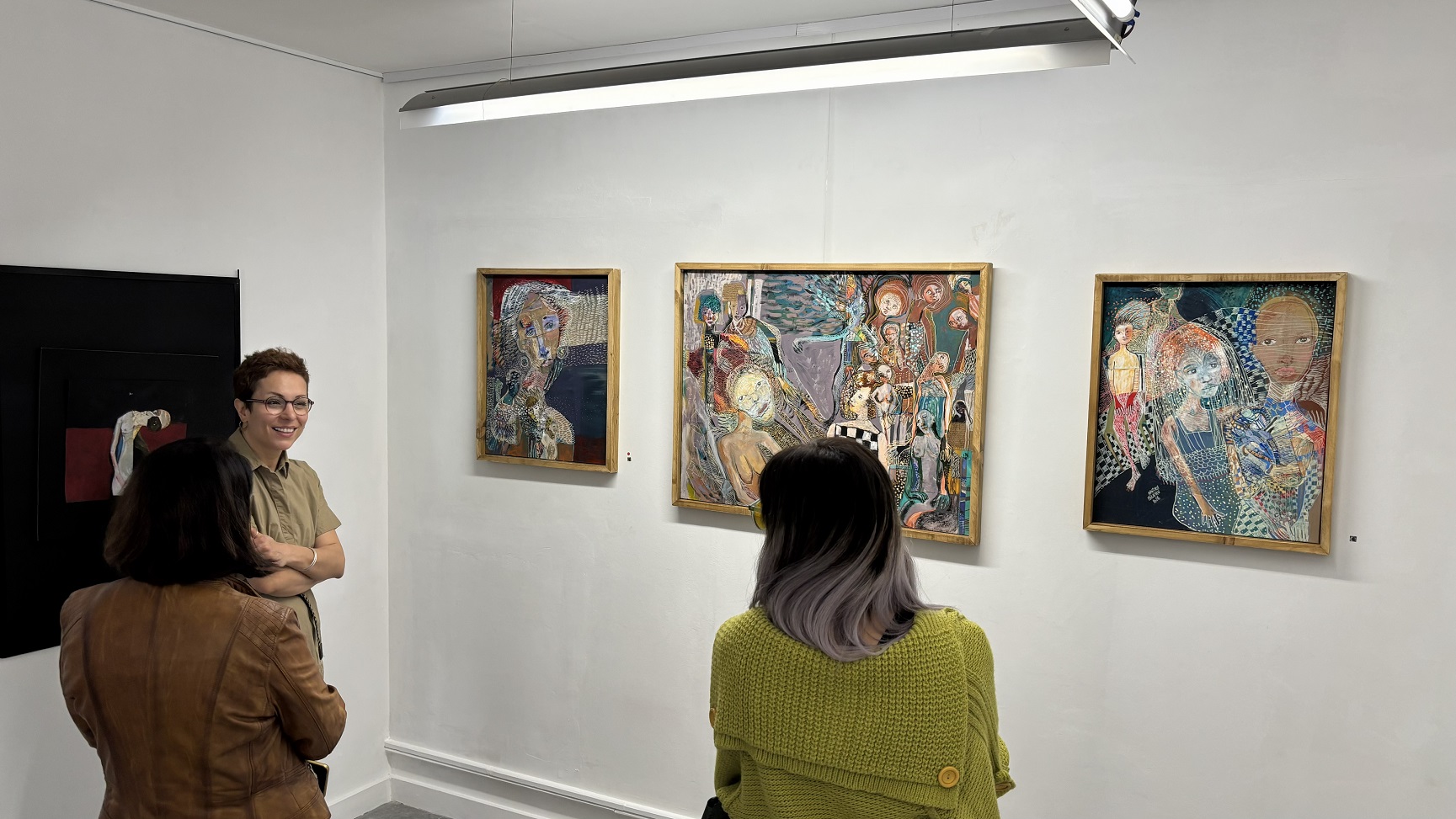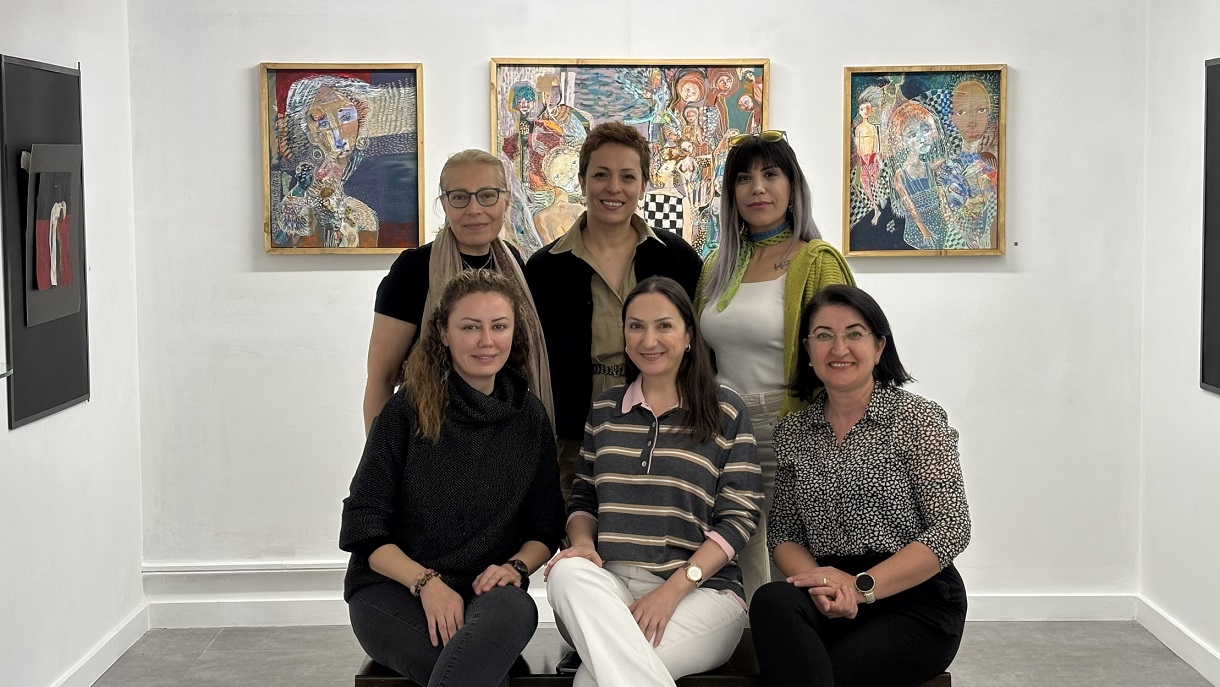 Sergi gezimiz sırasında ilgimizi çeken, üç ayrı çalışmasının bir arada yer aldığı tablosunun yapım sürecini anlatırken söyledikleri kadın olarak işlerimizi yaparken hemen hepimizin yaşadıklarından çok da farlı değildi: “Bu resimlerimi yaparken oğlum yanıma geldi ve boyalarla oynamaya başladı. Boyalara elini batırdıktan sonra tuvale bastı. Ben de oradan resmime devam ettim.”