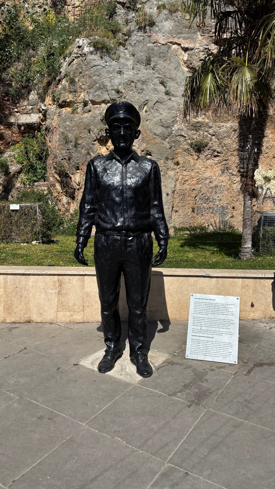 Dipnot: Antalya Büyükşehir Belediyesi tarafından 1 Temmuz 2021 tarihinde Kabotaj Bayramı’nda Kaleiçi İskele Camii yanına heykeli dikildi. Kaptan Mustafa Ekizler’in heykelinin sağ omzuna da kuşlarla ayrı bir bağı olduğu için güvercin sembolü koyuldu.
